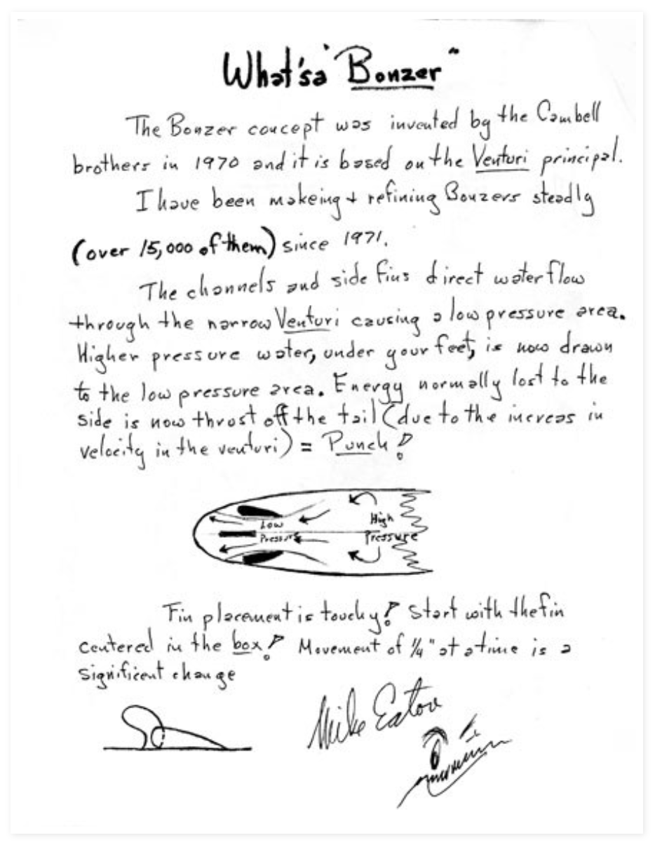 "Posiblemente el Thruster sea el diseño de tabla que mayor impacto ha tenido en la historia del surf. En cuanto al Bonzer, algunos dicen que tuvo alguna relevancia, y otros simplemente que no. Pero a todos los efectos, el Bonzer es la primera tabla de surf de tres quillas verdaderamente funcional que se diseñó. Dick Brewer y Reno Abellira también shapearon tablas de tres quillas en esos años, pero ellos colocaron las aletas laterales detrás de la aleta central, y su diseño no evolucionó.